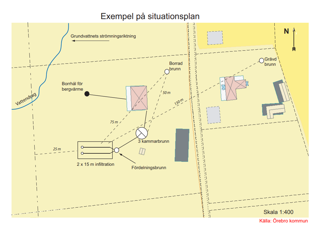 - Avstånd till egen och närboendes vattentäkt: minst 20 meter, helst 50 meter.