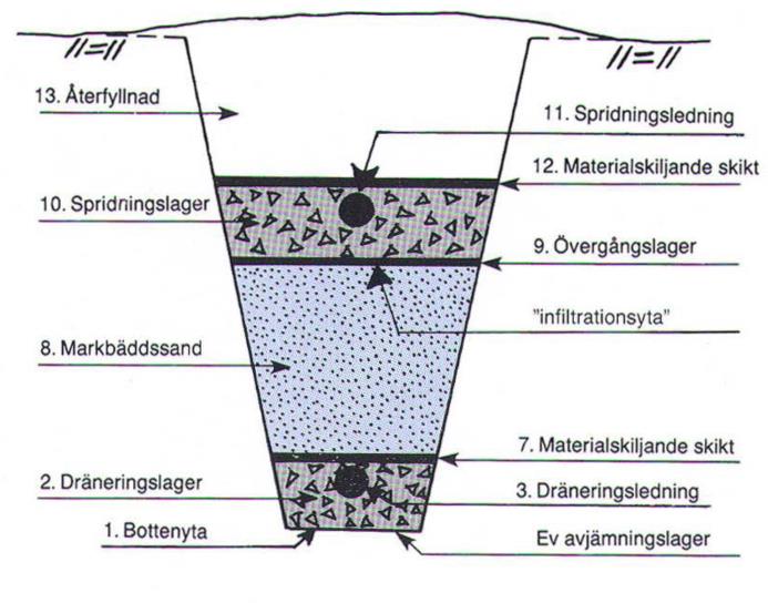 - Avstånd till högsta grundvattennivå och berg under infiltrationszonen: minst 1 meter, helst 2 meter.