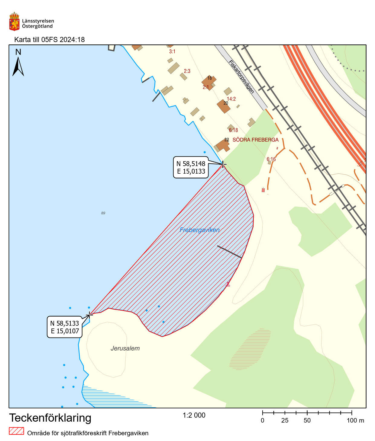 Förbudet gäller enligt Länsstyrelsen Östergötlands föreskrifter om förbud mot trafik med motordrivet fartyg och förbud mot ankring vid Jerusalemsbadet i Motala kommun.