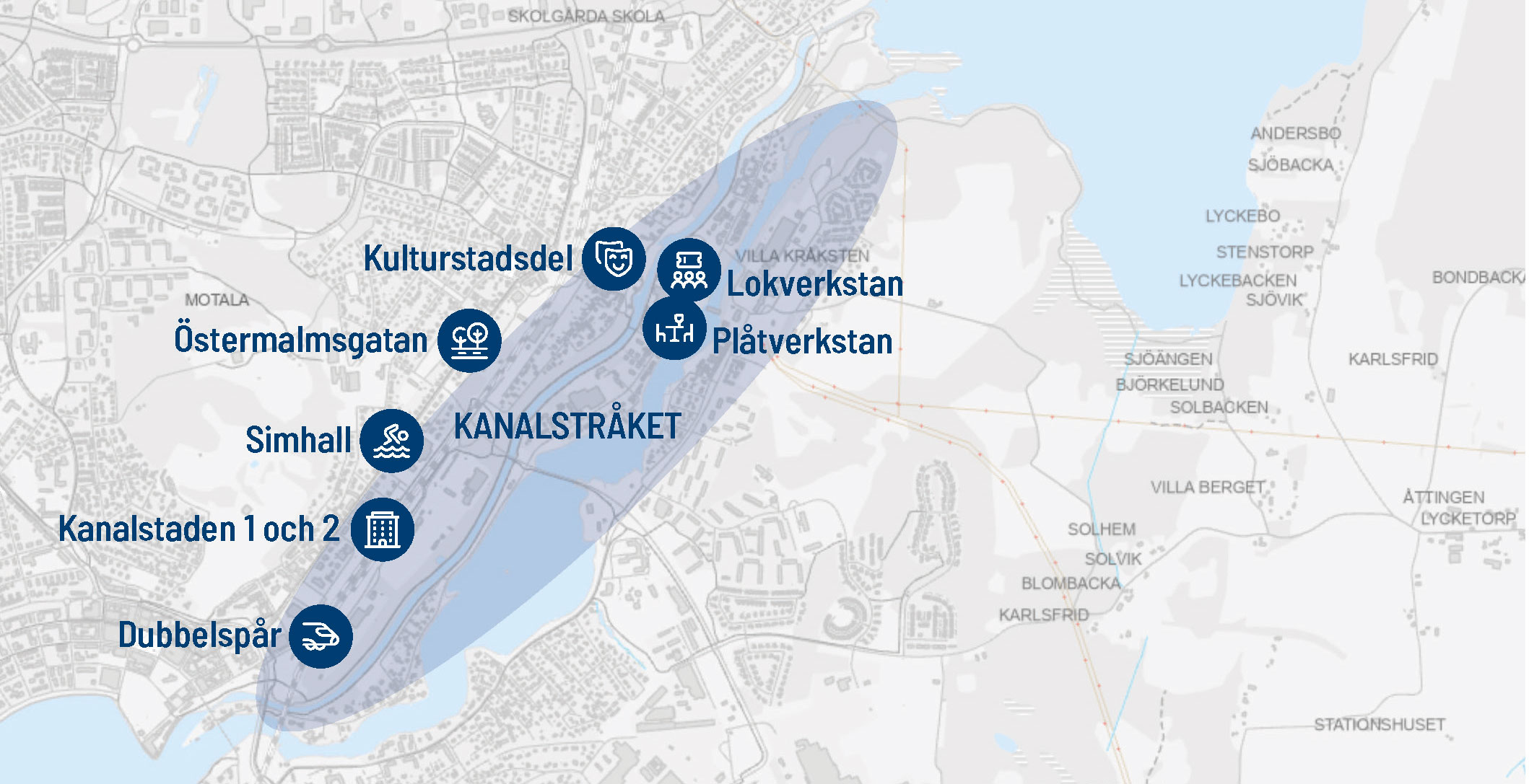 Planprogrammet omfattar flera delområden. Kanalstaden är i fokus och bedöms ha särskilt goda förutsättningar för ny stadsbebyggelse i ett centrumnära läge. Här finns möjlighet att skapa bostäder, offentliga miljöer och ett levande stadsliv. Även områden som Gamla Motala Verkstad, Dockområdet och Borenshult ingår och bidrar med kulturmiljöer, besöksmål och rekreativa värden.