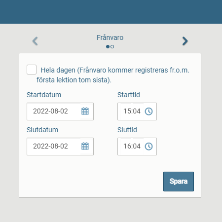 Om barnet ska vara borta en kortare stund på dagen bockar du inte i rutan ”Hela dagen” utan endast klockslag för frånvaron, starttid och sluttid. Glöm inte att spara.