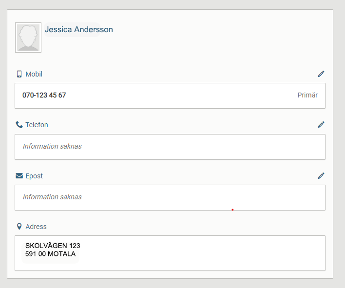 - Här fyller du i mobilnummer, annat telefonnummer och e-postadress. Din folkbokföringsadress är förifylld. Klicka på den lilla pennan för att redigera en post.